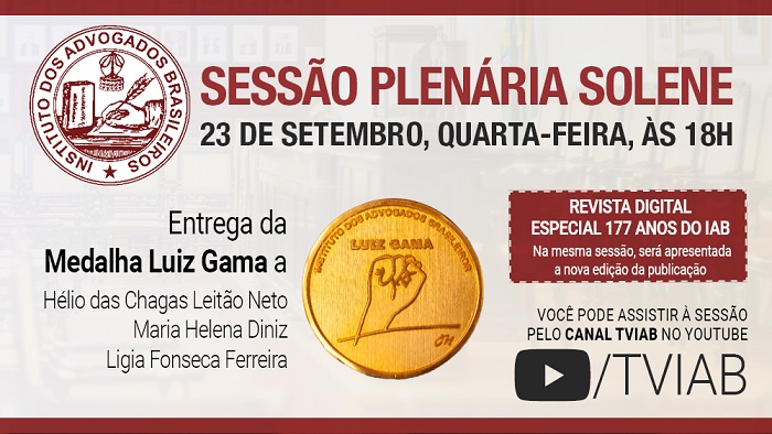 O Instituto dos Advogados Brasileiros (IAB) realizará uma Sessão Plenária Solene na próxima quarta-feira (23/9), às 18h, no canal TVIAB no YouTube, para entrega da Medalha Luiz Gama ao presidente da Comissão Nacional de Direitos Humanos da OAB Nacional, Hélio das Chagas Leitão Neto; à jurista Maria Helena Diniz e à professora do Departamento de Letras da Universidade Federal de São Paulo (Unifesp) Ligia Fonseca Ferreira. Desenhada especialmente para o IAB por Oscar Niemeyer, em 2009, quando o arquiteto tinha 101 anos de idade, a medalha é destinada àqueles que se destacam na defesa do estado democrático de direito. Na sessão, haverá também o lançamento da Revista Digital, edição especial 177 anos do IAB.