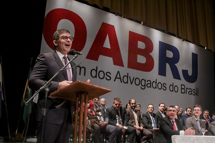 Luciano Bandeira durante o seu discurso de posseO presidente da OAB/RJ falou também sobre a implementação de projetos de capacitação profissional. “Pretendemos implantar um portal de oportunidades que ajude o acesso ao mercado de trabalho. Dessa forma, facilitaremos a interlocução com os escritórios em sua tarefa de recrutamento”, anunciou. Ele recordou a máxima do jurista Sobral Pinto, segundo o qual “a advocacia não é profissão de covardes”, e concluiu o discurso dizendo: “Que a coragem, a ética e o elevado espírito público do doutor Sobral guiem meus passos”.