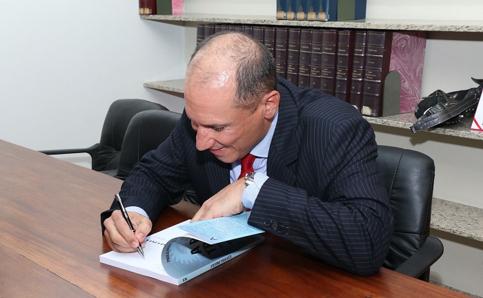 Paulo Renato Fernandes da Silva autografa um exemplar da coletânea por ele organizada
