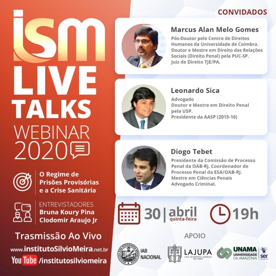 Este evento virtual discutirá o importante tema do regime de prisões provisórias e a crise sanitária, no próximo dia 30 de abril às 19hs, reunindo três conferencistas de alta envergadura e dois advogados criminalistas do Pará como entrevistadores. A realização é da Cátedra de Direito Penal do ISM - Instituto Silvio Meira e tem o apoio do IAB Nacional, da LAJUPA e da UNAMA - Universidade da Amazônia.
