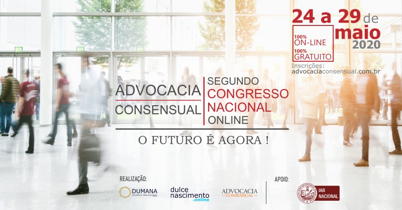 SEGUNDO CONGRESSO NACIONAL ONLINE ADVOCACIA CONSENSUAL. O advogado Carlos Pessoa de Aquino disse ... “ É uma honra representar o IAB e estar no rol de palestrantes do II Congresso Online Advocacia Consensual - O Futuro É Agora, onde discorrerei sobre o tema “Carreira na Advocacia” . O evento ocorrerá nos dias 25 a 29 de maio de 2020. O SEGUNDO CONGRESSO ONLINE reunirá , mais uma vez, profissionais de altíssima qualidade com um único propósito: Integrar pessoas com o interesse comum de partilhar informações e conhecimento para o desenvolvimento profissional e pessoal das diferentes carreiras jurídicas. Este congresso surgiu de uma caminhada profissional e amadurecimento da constatação crescente sobre a necessidade de informação esclarecida, da comunidade jurídica e civil, relativamente ao papel da advocacia consensual.